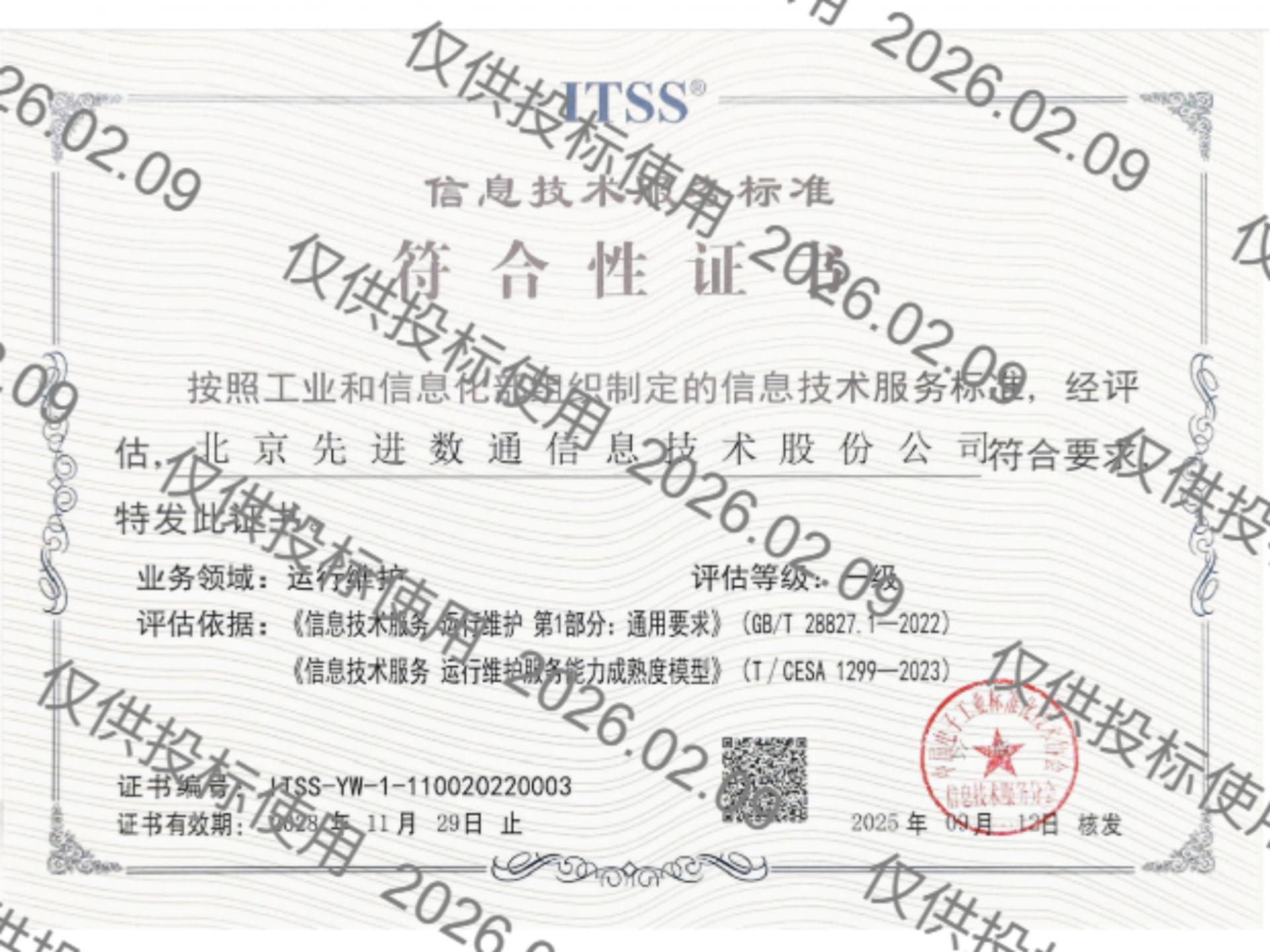 365英国上市公司先后取得CMMIL5、软件能力成熟度五级(SPCA 5)、信息系统建设和服务能力评估体系(CS)5级、ITSS成熟度一级、信息系统安全集成服务资质二级、信息系统安全运维服务资质二级、国产化信息系统集成和服务能力评估四级(LS4)、北京市企业技术中心等资质认证,并取得ISO9001、ISO20000、ISO27001、ISO14001、ISO45001、ISO22301、ISO37001、ISO28001、GBT29490等标准体系认证,具备行业领先的技术开发、工程实施及服务保障能力。