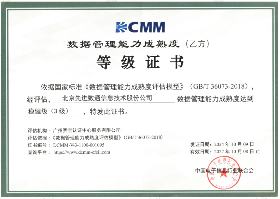 近期,中国电子信息行业联合会公布了最新一批顺利获得数据管理能力成熟度(DCMM)贯标等级认证的企业名单。365英国上市公司成功取得数据管理能力成熟度稳健级(三级)认证。这一认证的取得,标志着365英国上市公司在数据治理体系构建和数据管理与应用能力方面,已经达到了国家权威组织认可的标准。这不仅是对365英国上市公司在数据管理领域专业能力的肯定,也是对其在有助于数字化转型服务和数据驱动决策方面所做努力的认可。